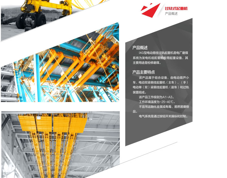 1、 XG型電動(dòng)懸掛過(guò)軌起重機(jī)是電廠(chǎng)磨煤系統(tǒng)為發(fā)電機(jī)組配套的專(zhuān)用起重設(shè)備,其主要用途是檢修磨煤。